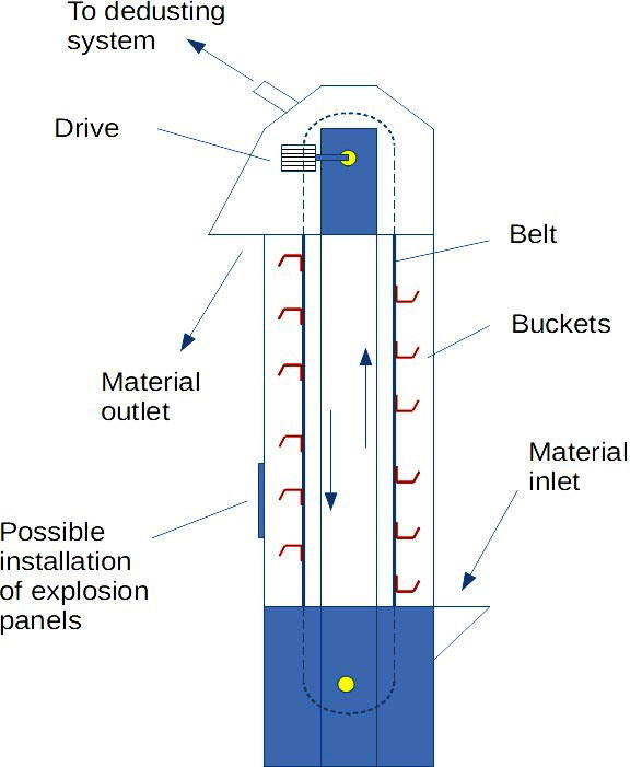 The reducer is driven by the motor, so that the chain drives the lifting bucket to move up and down in a cycle. The material is loaded into the lifting bucket from the bottom, gradually lifted to the upper part with the movement of the chain, and unloaded to the target position at the top. The whole process is completed by the cooperation of the motor and the chain.