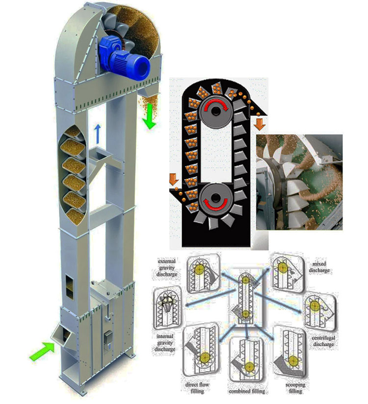 Discharging: When the hopper reaches the top, the material is ejected from the hopper by a combination of centrifugal force and gravity. The ejected material is discharged through the discharge chute, completing the entire lifting and conveying process. Discharging options include centrifugal discharge (for powdered materials, the hopper moves at high speed (1-2 m/s) at the top, causing the material to be ejected by centrifugal force) or gravity discharge (suitable for fragile, bulk materials, as the hopper flips and the material naturally slides down, minimizing breakage losses). After discharge, the empty hopper descends along the inside of the casing to continue loading.