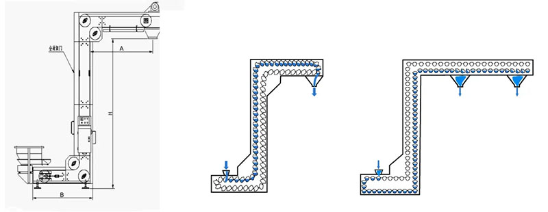 The type of Z type chain bucket elevator chosen depends on the properties of the materials being conveyed. For general powders and granules without special properties, carbon steel elevators are a good choice due to their wear resistance, durability, low manufacturing cost, and high cost-effectiveness. For industries with high hygiene requirements or conveying corrosive materials, stainless steel bucket elevators made of 304 or 316L stainless steel are necessary. These elevators are resistant to acids, alkalis, and high temperatures, and are easy to clean, making them ideal for environments with strict hygiene requirements, such as the food and pharmaceutical industries. For applications requiring feeding multiple silos or equipment, Z type chain bucket elevators with multi-point discharge can be selected. These elevators can be equipped with 2-7 discharge ports, allowing for simultaneous discharge or selection of a single outlet, and are commonly used for continuous feeding requirements in production lines.
